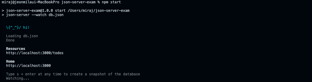 터미널에 다음과 같이 명령어를 입력하여 JSON 서버를 실행한다. JSON 서버가 데이터베이스 역할을 하는 db.json 파일의 변경을 감지하게 하려면 watch 옵션을 추가한다. 기본 포트를 사용하기 싫다면 두번째 명령어를 사용해 포트를 변경하면 된다.