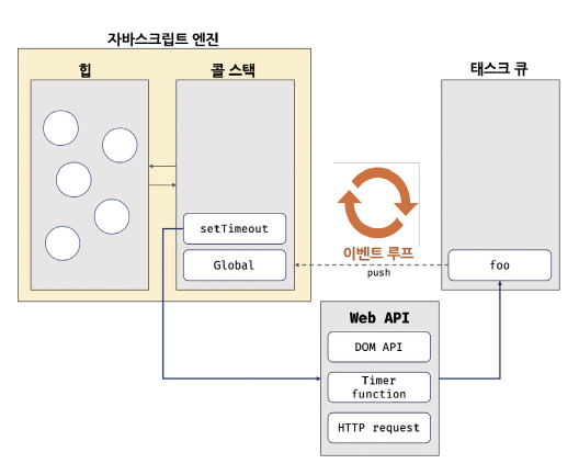 브라우저의 Web API인 setTimeout 함수가 호출되면 자바스크립트 엔진의 콜 스택에 푸쉬되어 실행된다.