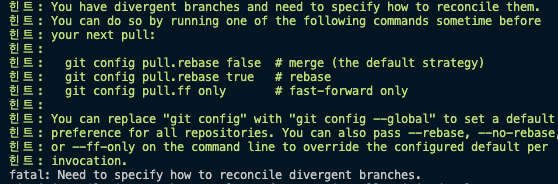우선 먼저 위의 상황은 local과 remote의 싱크가 맞지 않아 브랜치가 갈라졌다는 것이다.